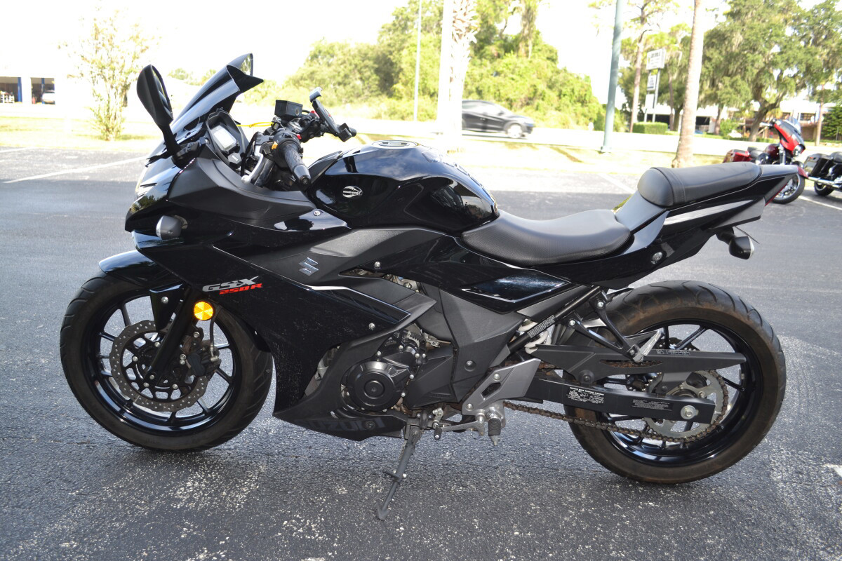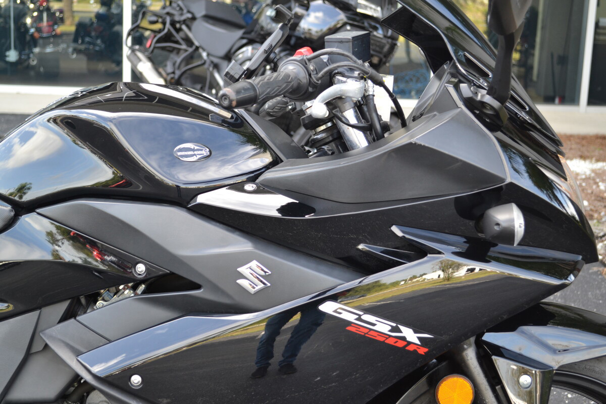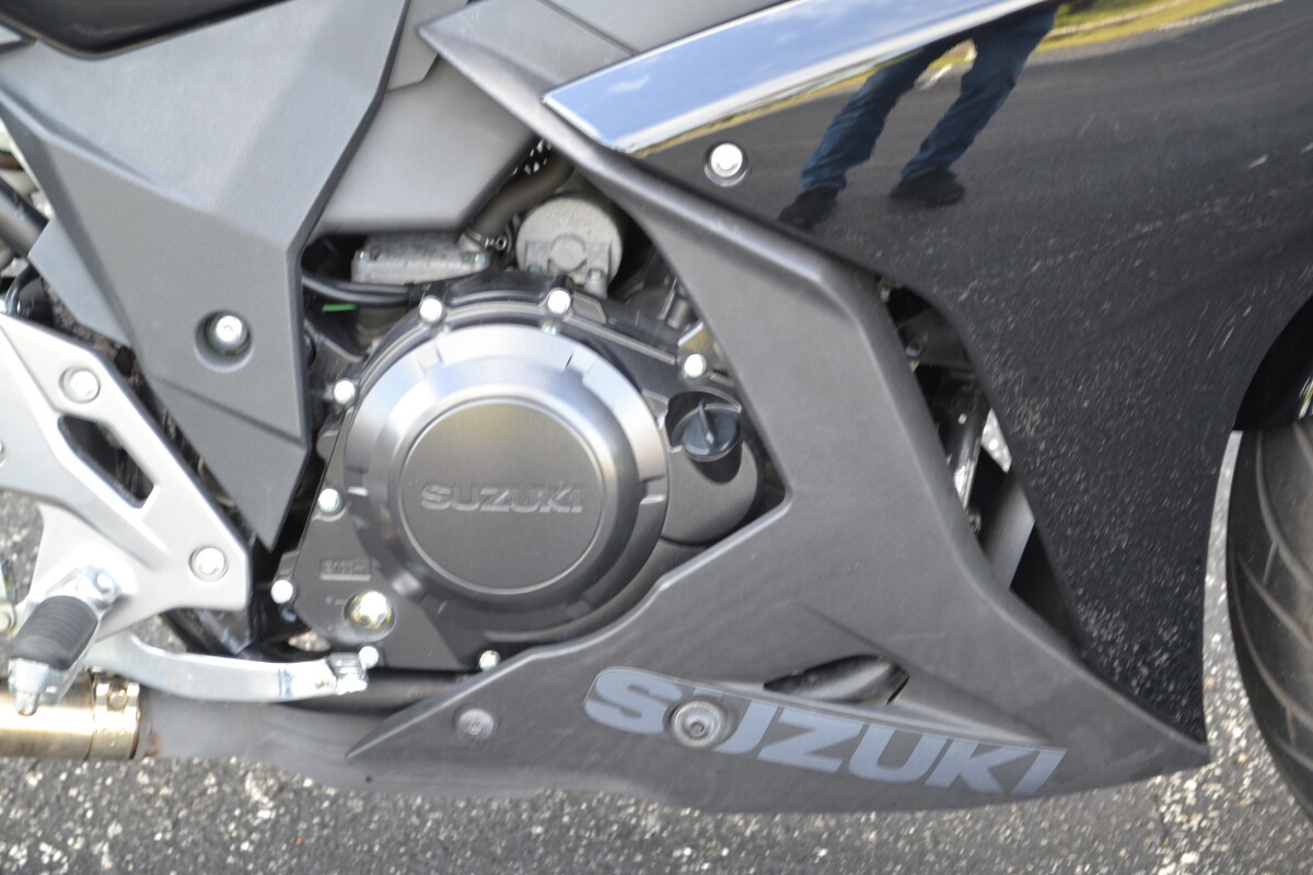 Introducing the new GSX250R - a fully faired street machine that brings the excitement and riding satisfaction of Suzuki’s Katana sport bike heritage to a broader audience. Built to deliver the Katana’s unique spirit to a new generation of riders, this sportbike has smart performance, engaging styling, and comfort features that will appeal to a broad base of enthusiasts. This approachable street-sport bike features a proven, twin-cylinder, fuel-injected engine wrapped in stylish full-fairing bodywork. With responsive yet easy-to-control performance, exceptional fuel efficiency, nimble handling, and a comfortable riding position, the GSX250R is equally at home on the daily commute as it is on extended outings. A low seat height, slim fuel tank and overall light weight makes the new GSX250R an exciting and unintimidating ride. Ten-spoke aluminum wheels and tuned KYB suspension keep the bike nimble and responsive for city streets as well as open roads. With a four-gallon fuel tank and highly efficient powerplant, the GSX250R has a riding range of well over 250 miles. This new model adds to Suzuki’s unrivaled selection of small displacement motorcycles created specifically to appeal to a variety of riders. From the terrific new VanVan 200, the sporty-standard GW250, the classic looking TU250X, and now the GSX250R, Suzuki provides an assortment of sensible, accessible models to choose from. Key FeaturesNew fully-faired, quarter-liter sportbike with aggressive, flowing styling true to the Suzuki Katana heritageFuel-injected twin-cylinder engine delivers a responsive, broad power band with class-leading fuel economy of approximately 76 MPG.The GSX250R features a reverse-lit LCD instrument panel, a bright halogen headlight, plus distinctive position lamps and taillight using new tech, surface-emitting LEDs.Comfortable, roomy ergonomics for rider and passenger, with a slim fuel tank that helps the rider easily plant their feet on the ground when stopped.New style 10-spoke wheels, petal-type brake rotors, and quality KYB suspension components round out a chassis ready for any riding assignment.Engine Features The 248cc parallel-twin engine that powers the GSX250R has been refined to maximize low- to mid-range torque to deliver a power characteristic that emphasizes ease of control.Intelligent engine design and fuel-injection (EFI) tuning yields class-leading fuel economy while satisfying world-wide emission requirements.The EFI also stabilizes the engine idle and helps provide nearly linear throttle response for clean, exciting performance.The camshaft profile maximizes engine performance when riding at road speeds between 15 to 55 MPH. This helps the GSX250R deliver true, practical performance.The valve train employs new, roller type rocker arms for valve actuation to reduce mechanical losses.New intake valves have a slimmer stem profile near the head to optimize airflow into the combustion chamber.Reshaped, low-tension piston rings are used to reduce friction while a special honing pattern on the cylinder wall increases oil retention for additional friction reduction.A coupling-type balancer shaft fitted to the engine’s crankshaft reduces vibration and enhances rider comfort.A new type of oil pump is used in the GSX250R to reduce frictional loss while providing excellent engine lubrication.Dual head-pipes effectively route the exhaust through a high-flow catalyzer and into a new, stylish solo muffler covered with a buffed stainless-steel shield.6. Designed to get the most out of the engine’s mid-range performance and emit a pleasing sound, the GSX250R new exhaust is lightweight and stylish.A six-speed transmission, with gear ratios well mated to the engine output, further improves low- to mid-range power delivery. Chassis Features The Katana essence is present in the GSX250R’s full bodywork that features a sporty and aggressive style with a futuristic flair. Select styling cues from historic and current Suzuki sportbikes appeal to both new and experienced riders.The fairing routes cooling air to the radiator while moving hot air from the engine away from the rider.7. The front of the motorcycle features unique dual LED position lights, angular fairing-mounted mirrors and an effective sport windshield that incorporates slots to reduce wind buffeting.The sharp tail has styling and a LED taillight reminiscent of a GSX-R1000R.The stylish and trim fuel tank holds 4.0 US gallons (15.0 L) of gasoline for excellent riding range. With a full tank of gasoline, the Katana 250 has a riding range of approximately 280 miles.The comfortable contoured rider’s seat has a low seat height of 31.1 inch (790 mm).The separate rear seat is set higher so the passenger has a better view over the rider’s shoulder.The semi double-cradle frame provides exceptional support for the GSX250R’s effective running gear and exciting bodywork.The well-tuned telescopic front fork soaks up bumps for smooth tracking up front – whether riding irregular city streets or faster open roads.Rear suspension action is handled by a mono-shock system that stays hidden from view to augment the bike’s performance style. With seven-way adjustable spring preload, the rear suspension can be tuned for a passenger or cargo.The clip-on handlebar’s design and reach were developed to provide a comfortable riding position.The 5-way adjustable front brake lever allows the rider to position the lever for comfort and confidence.Hydraulic, petal-style disc brakes front and rear provide consistent and controlled braking whether commuting on city streets or roaming the open road.New-style, ten-spoke 17-inch aluminum wheels hold road-grabbing IRC tires that provide sporting performance through a variety of road conditions. Electrical Features The GSX250R is equipped with a new, reverse-lit multi-function LCD instrumentation panel that displays a variety of information.At the top of the display is a bar-graph tachometer and in the center i