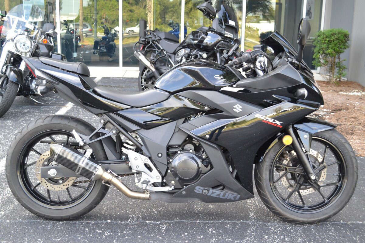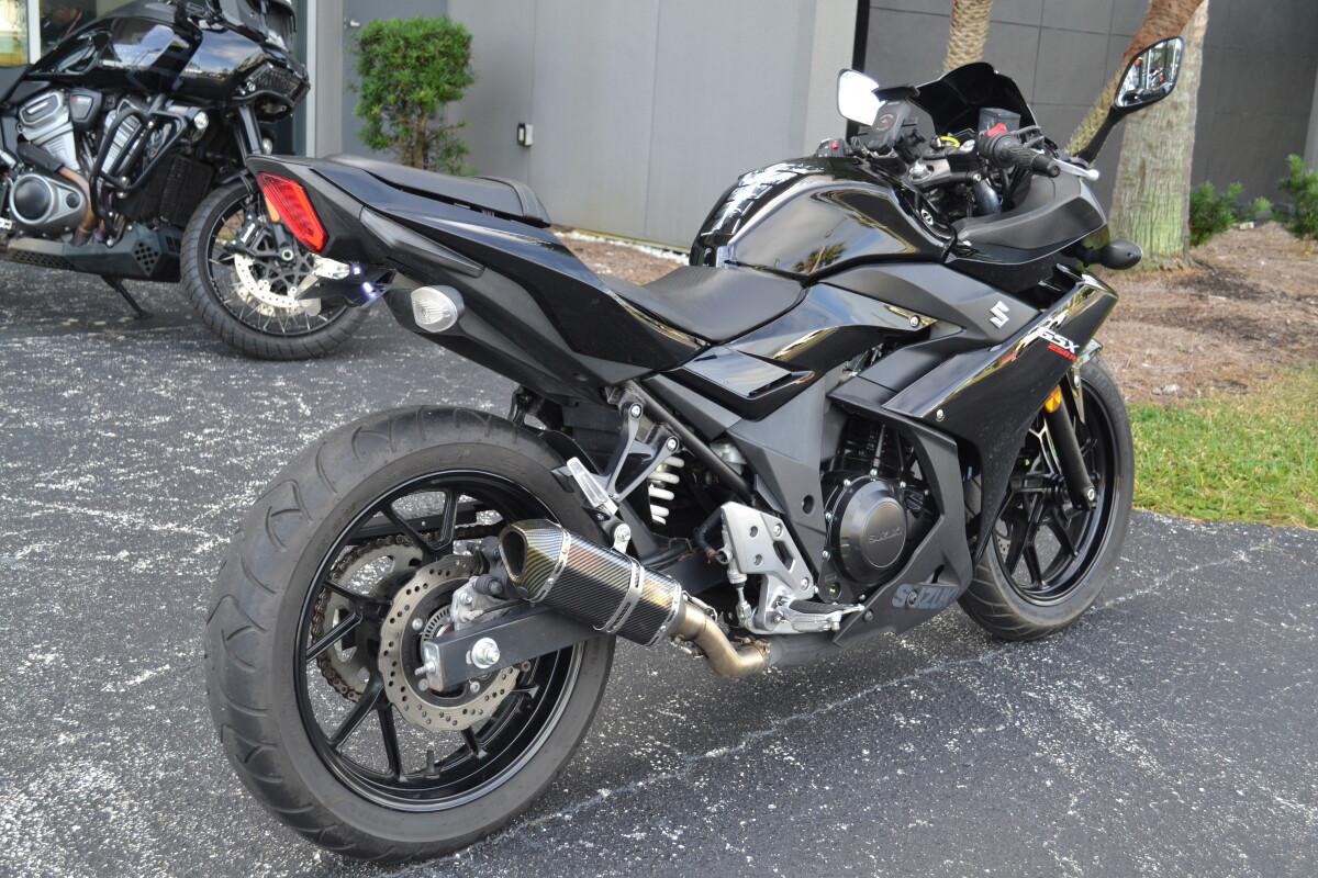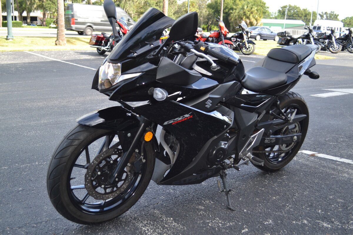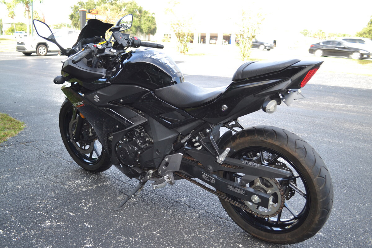 Introducing the new GSX250R - a fully faired street machine that brings the excitement and riding satisfaction of Suzuki’s Katana sport bike heritage to a broader audience. Built to deliver the Katana’s unique spirit to a new generation of riders, this sportbike has smart performance, engaging styling, and comfort features that will appeal to a broad base of enthusiasts. This approachable street-sport bike features a proven, twin-cylinder, fuel-injected engine wrapped in stylish full-fairing bodywork. With responsive yet easy-to-control performance, exceptional fuel efficiency, nimble handling, and a comfortable riding position, the GSX250R is equally at home on the daily commute as it is on extended outings. A low seat height, slim fuel tank and overall light weight makes the new GSX250R an exciting and unintimidating ride. Ten-spoke aluminum wheels and tuned KYB suspension keep the bike nimble and responsive for city streets as well as open roads. With a four-gallon fuel tank and highly efficient powerplant, the GSX250R has a riding range of well over 250 miles. This new model adds to Suzuki’s unrivaled selection of small displacement motorcycles created specifically to appeal to a variety of riders. From the terrific new VanVan 200, the sporty-standard GW250, the classic looking TU250X, and now the GSX250R, Suzuki provides an assortment of sensible, accessible models to choose from. Key FeaturesNew fully-faired, quarter-liter sportbike with aggressive, flowing styling true to the Suzuki Katana heritageFuel-injected twin-cylinder engine delivers a responsive, broad power band with class-leading fuel economy of approximately 76 MPG.The GSX250R features a reverse-lit LCD instrument panel, a bright halogen headlight, plus distinctive position lamps and taillight using new tech, surface-emitting LEDs.Comfortable, roomy ergonomics for rider and passenger, with a slim fuel tank that helps the rider easily plant their feet on the ground when stopped.New style 10-spoke wheels, petal-type brake rotors, and quality KYB suspension components round out a chassis ready for any riding assignment.Engine Features The 248cc parallel-twin engine that powers the GSX250R has been refined to maximize low- to mid-range torque to deliver a power characteristic that emphasizes ease of control.Intelligent engine design and fuel-injection (EFI) tuning yields class-leading fuel economy while satisfying world-wide emission requirements.The EFI also stabilizes the engine idle and helps provide nearly linear throttle response for clean, exciting performance.The camshaft profile maximizes engine performance when riding at road speeds between 15 to 55 MPH. This helps the GSX250R deliver true, practical performance.The valve train employs new, roller type rocker arms for valve actuation to reduce mechanical losses.New intake valves have a slimmer stem profile near the head to optimize airflow into the combustion chamber.Reshaped, low-tension piston rings are used to reduce friction while a special honing pattern on the cylinder wall increases oil retention for additional friction reduction.A coupling-type balancer shaft fitted to the engine’s crankshaft reduces vibration and enhances rider comfort.A new type of oil pump is used in the GSX250R to reduce frictional loss while providing excellent engine lubrication.Dual head-pipes effectively route the exhaust through a high-flow catalyzer and into a new, stylish solo muffler covered with a buffed stainless-steel shield.6. Designed to get the most out of the engine’s mid-range performance and emit a pleasing sound, the GSX250R new exhaust is lightweight and stylish.A six-speed transmission, with gear ratios well mated to the engine output, further improves low- to mid-range power delivery. Chassis Features The Katana essence is present in the GSX250R’s full bodywork that features a sporty and aggressive style with a futuristic flair. Select styling cues from historic and current Suzuki sportbikes appeal to both new and experienced riders.The fairing routes cooling air to the radiator while moving hot air from the engine away from the rider.7. The front of the motorcycle features unique dual LED position lights, angular fairing-mounted mirrors and an effective sport windshield that incorporates slots to reduce wind buffeting.The sharp tail has styling and a LED taillight reminiscent of a GSX-R1000R.The stylish and trim fuel tank holds 4.0 US gallons (15.0 L) of gasoline for excellent riding range. With a full tank of gasoline, the Katana 250 has a riding range of approximately 280 miles.The comfortable contoured rider’s seat has a low seat height of 31.1 inch (790 mm).The separate rear seat is set higher so the passenger has a better view over the rider’s shoulder.The semi double-cradle frame provides exceptional support for the GSX250R’s effective running gear and exciting bodywork.The well-tuned telescopic front fork soaks up bumps for smooth tracking up front – whether riding irregular city streets or faster open roads.Rear suspension action is handled by a mono-shock system that stays hidden from view to augment the bike’s performance style. With seven-way adjustable spring preload, the rear suspension can be tuned for a passenger or cargo.The clip-on handlebar’s design and reach were developed to provide a comfortable riding position.The 5-way adjustable front brake lever allows the rider to position the lever for comfort and confidence.Hydraulic, petal-style disc brakes front and rear provide consistent and controlled braking whether commuting on city streets or roaming the open road.New-style, ten-spoke 17-inch aluminum wheels hold road-grabbing IRC tires that provide sporting performance through a variety of road conditions. Electrical Features The GSX250R is equipped with a new, reverse-lit multi-function LCD instrumentation panel that displays a variety of information.At the top of the display is a bar-graph tachometer and in the center i